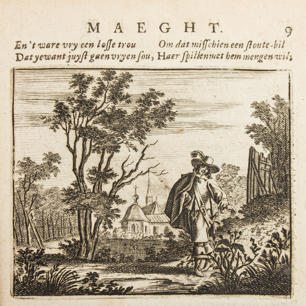 Lovely copy of a finely illustrated classic in this field, of which the first edition appeared in 1625. The first two chapters (virgin and maid) have titles beginning thus: "Wegh-wyser ten Huuwelyk, uyt den Doolhof der Kalverliefde". The other parts incorporate in the titles the phrase "Christelyk Huys-wyf", in which the woman is likened to the seasons (bride=Spring, wife=Summer, mother=Autumn and widow=Winter).