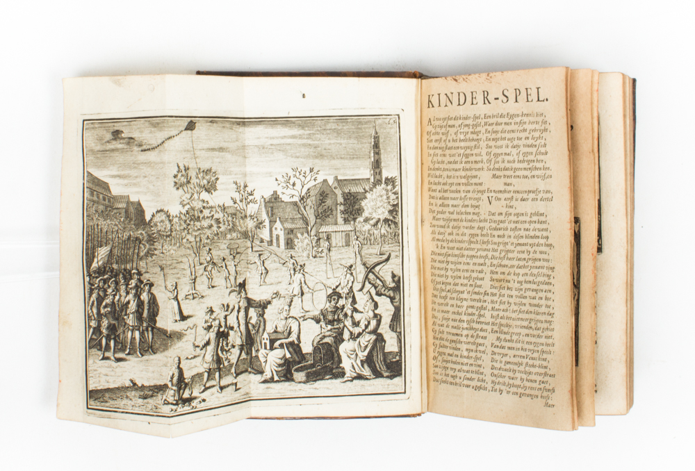 Afgebeeld in ses Hooft-stukken, Maecht, Vryster, Bruyt, Vrouwe, Moeder, Weduwe. Behelsende mede de mannelyke Tegen-plichten. Door J. Cats. Amsterdam, de Erven van de Wed: G. de Groot, en Antony van Dam; in Compagnie, 1720, (22),538 p., with engraved frontispiece, folding engraved plate (children's games) and 36 half-page engraved illustrations, all after Adriaen van de Venne, contemporary calf with gilt, ribbed back with morocco title shield.