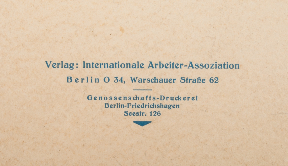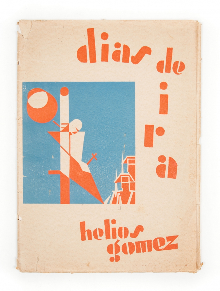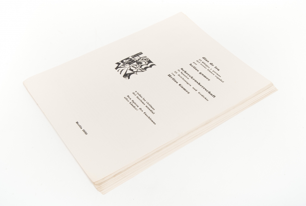por Helios Gomez. Schreckensherrschaft in Spanien. 23 Zeichnungen und Gedichte von Helios Gomez. Berlin, (Internationale Arbeiter-Assoziation), 1930, (4 text p. with 4 small woodcut illustrations) and 23 woodcuts above poems and titles in German, Spanish, English and Dutch, loose as published in original paper portfolio with woodcut in orange and blue, folio.