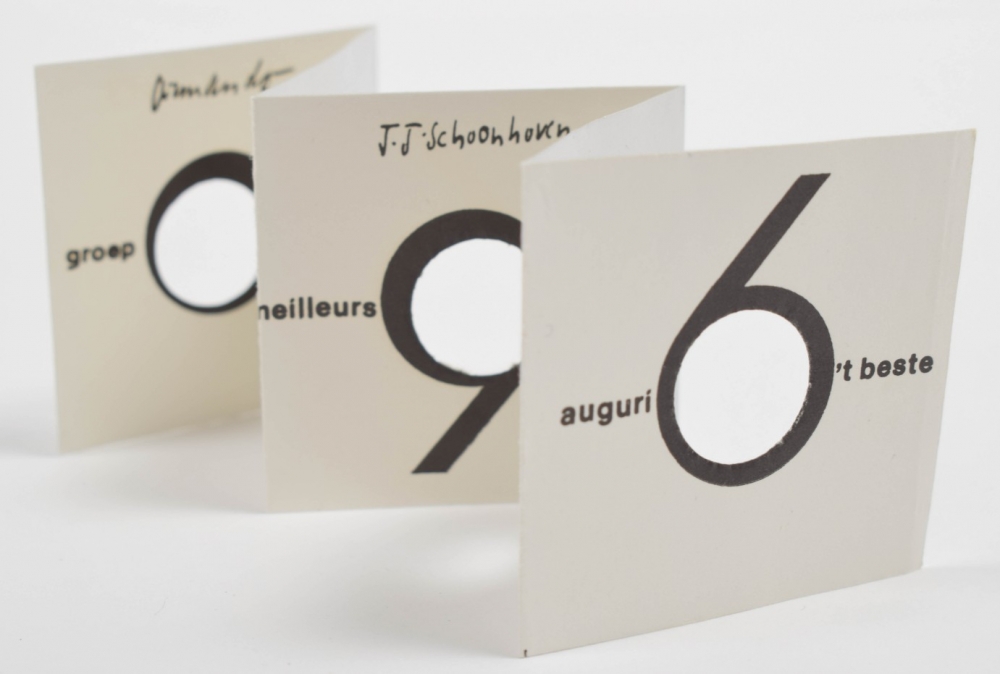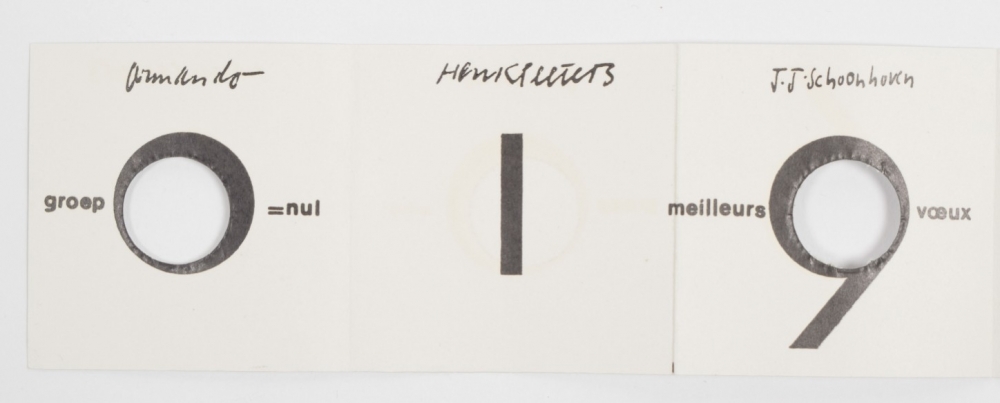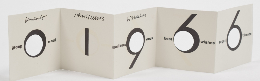 Text along the sheet says: group O =nul, meilleurs voeux, best wishes, auguri, 't beste, 1966. Signed in black ink by Armando, Henk Peeters and J.J. Schoonhoven recto. Fine copy. Rare.