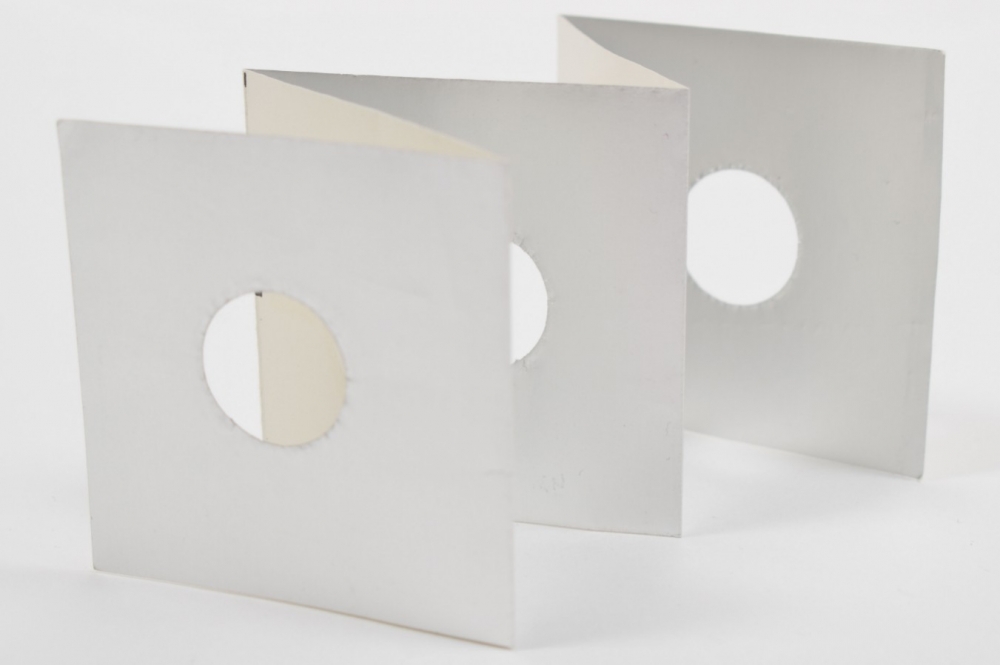 Harmonica folded sheet with die cut hole. 30 x 6 cm, closed 6 x 6 cm. Recto printed black on white paper, silver paper verso. Graphic play with numbers represented by the die cut hole.