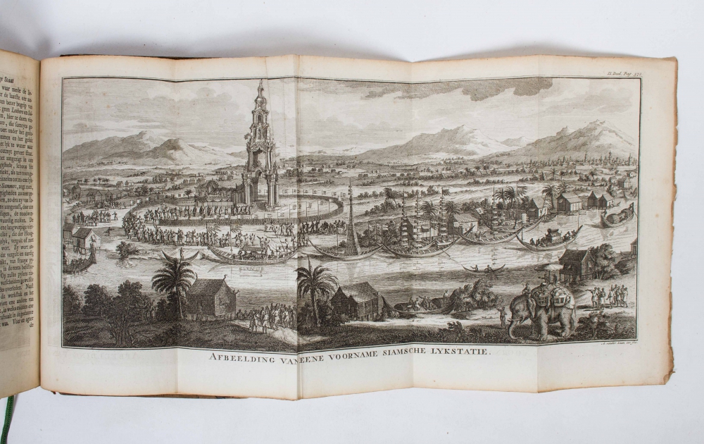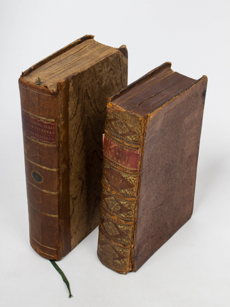 Behelzende de (...) Sundasche Eilanden (...)/ (...) de Koningkrijken Pegu, Ava Arrakan, Acham (...) en het eiland Ceilon. Eerst in 't Engelsch beschreven door Th. Salmon, nu vertaald en merkelyk vermeerderd door M. van Gogh (...). (II in second edition). Amsterdam, I. Tirion, 1739/ 1731, (12),676,(14); (8),680,(8) p., both volumes with engraved frontispiece, volume II with 2 folding maps and 8 (of 9) (folding) plates, volume III with 2 folding maps and 10 (folding) plates, contemporary half leather/full leather (not uniform).