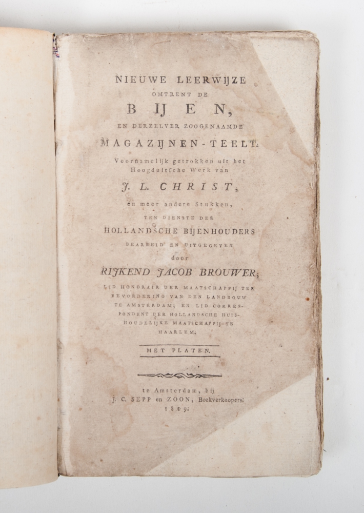 Voornamelijk getrokken uit het Hoogduitsche werk van J.L. Christ, en meer andere stukken, ten dienste der Hollandsche bijenhouders bearbeid en uitgegeven door Rijkend Jacob Brouwer. Amsterdam, J.C. Sepp en Zoon, 1809, XLII,308 p., with 3 (folding) engraved plates, contemporary cardboard.