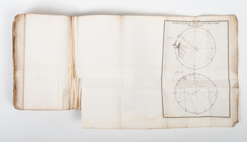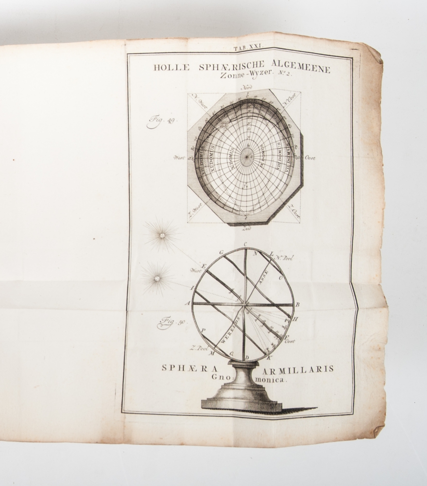 Namelyk, hoe men op een Sphaera Convexa, of Ronde Kloot, allerley Zonnewysers Meetkonstig beschryven kan. Als mede om in een Sphaera Concava of Halve Holle Kloot veelerley uur- en andere cirkels te beschryven. Mitsgaders een berigt, hoe men de Spaera Armillaris Gnomonica, of Hemel-Kring-Zonnewyser toestellen kan. Gedaan, door Johann Hermann Knoop. Leeuwarden, H.A. de Chalmot, 1761, (8),244,(8) p., with 21 engraved plates, contemporary cardboard.