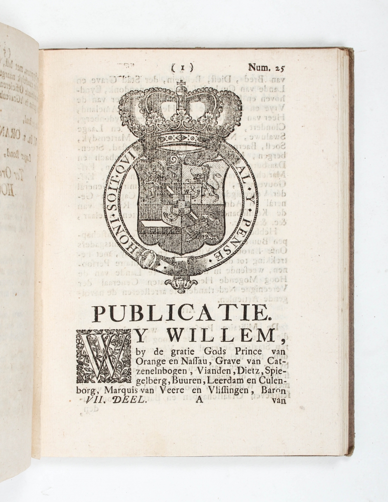 All resolutions with reference number in the top right-hand corner. Contains e.g. the following resolutions: Num. 77: Ordre en Reglement op de Wachten, en andere Saaken, in de respective Guarnisoensplaatsen (14 January 1688); No. 11: Ordres van Zyne Hoogheid aangaande het formeeren der Generaale Lyste, van de Regimenten, of Bataillons Infanterie; als meede van de Rangeer- en Recruyten-Lysten, der Compagnien (4 Feb. 1771, with 4 folding lists, 1x partly completed by hand); Num. 17 (Aug. 1776) and No. 27 (22 July 1777) concerning military expeditions in Suriname, e.g. by Colonel Fourgeoud; Num. 21 (22 August 1772) Zyne Hoogheid heeft nodig geoordeelt, aan elk Regiment Infanterie van de Trouppes van den Staat een vast Merkteeken te geeven, om het zelve te doen graveeren op de Geweeren en waapenen (incl. unique, personal codes, important for the current identification of antique weapons) and resolutions concerning deserters, court-martials, due debts of officers (excepting underage officers), Surgeon-Majors, military dress regulations, absenteeism and payment of wages.