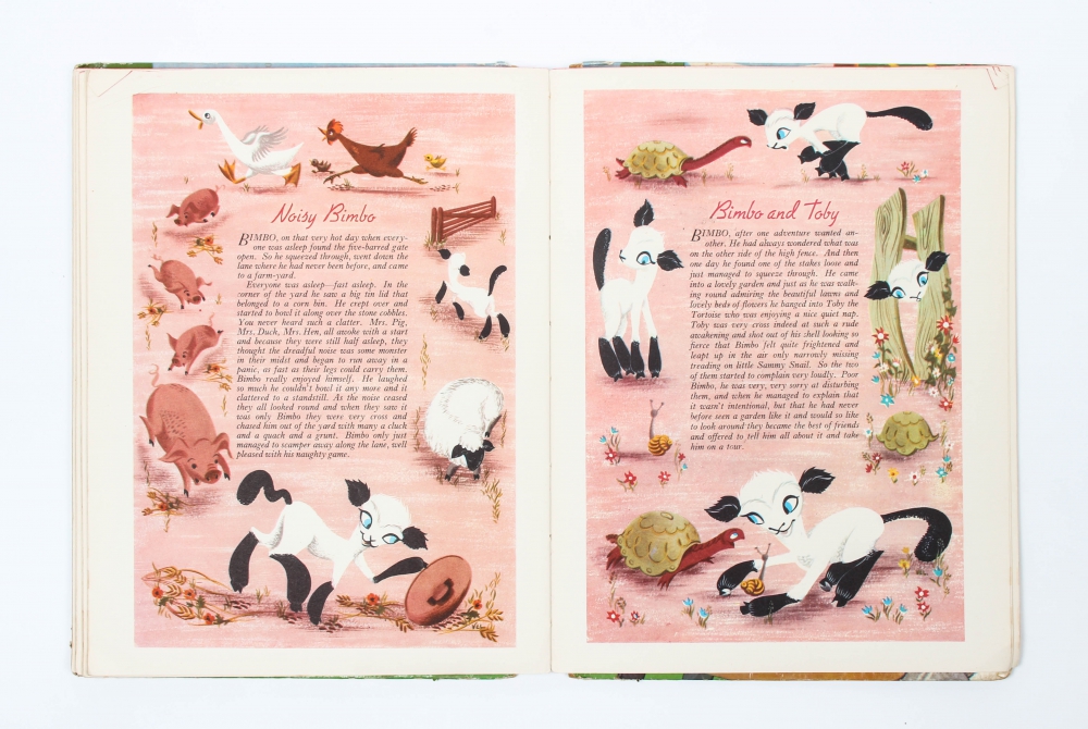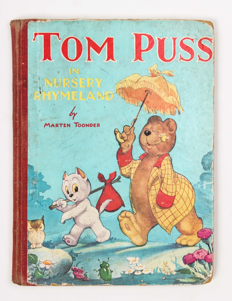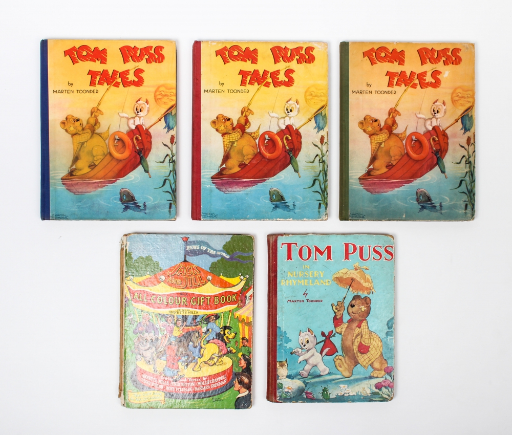 Tom Puss Tales, Birn Brothers, 1946. All three copies: with red, green and blue cloth back. The latter with dust jacket + Jack and Jill All colour gift book no 2. Edited by Annette Mills, Better Book, 1954. Lacks spine (as nearly always). With story "The fair" + Tom Puss in Nursery Rhymeland, Marks & Spencer, 1948. Rubbing to outside and slightly soiled.